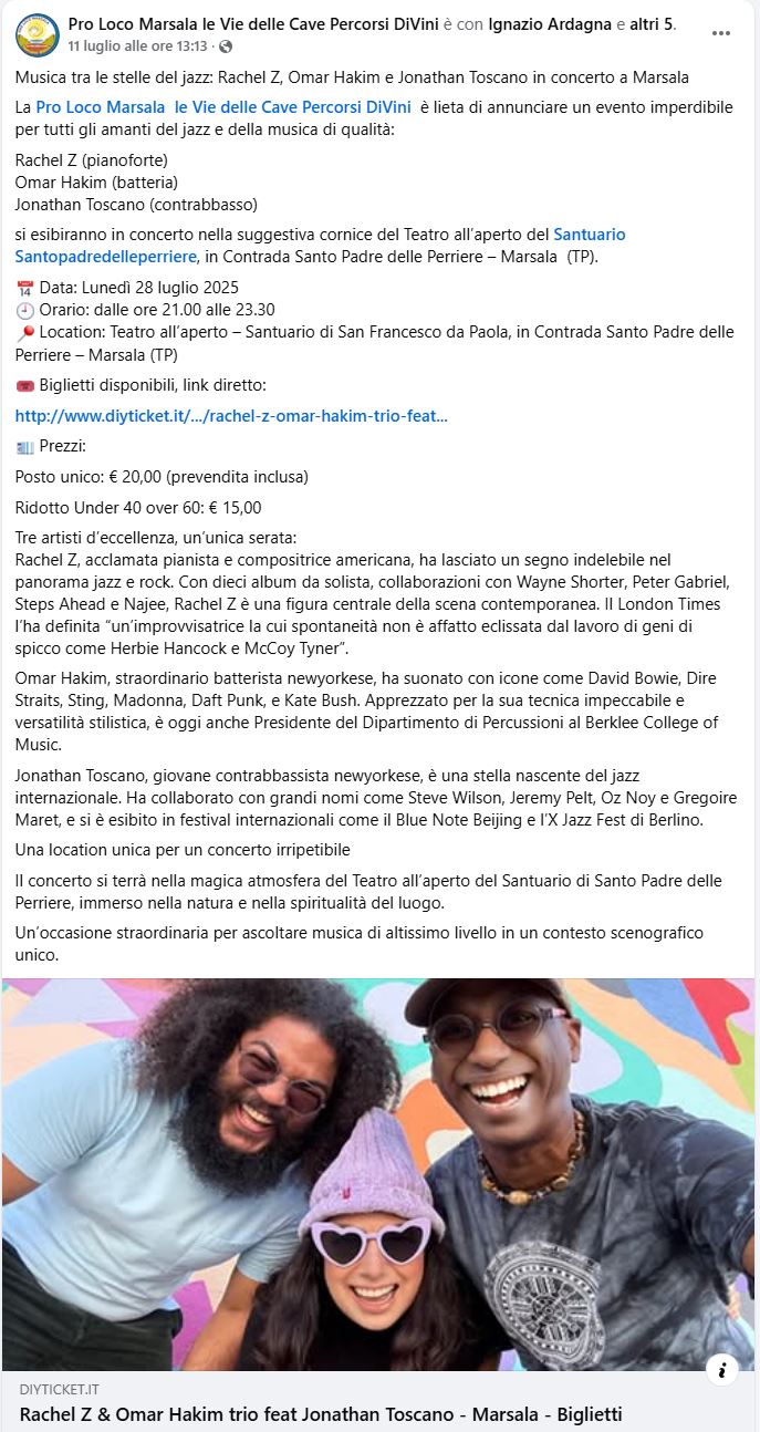 Tre artisti d'eccellenza, un'unica serata: Rachel Z acclamata pianista e compositrice americana, Omar Hakim straordinario batterista newyorkese, Jonathon Toscano giovane controbassista newyorkese-una location unica per un concerto irripetibile nella magica atmosfera del Teatro all'aperto del Santuario di Santo Padre delle Perriere
