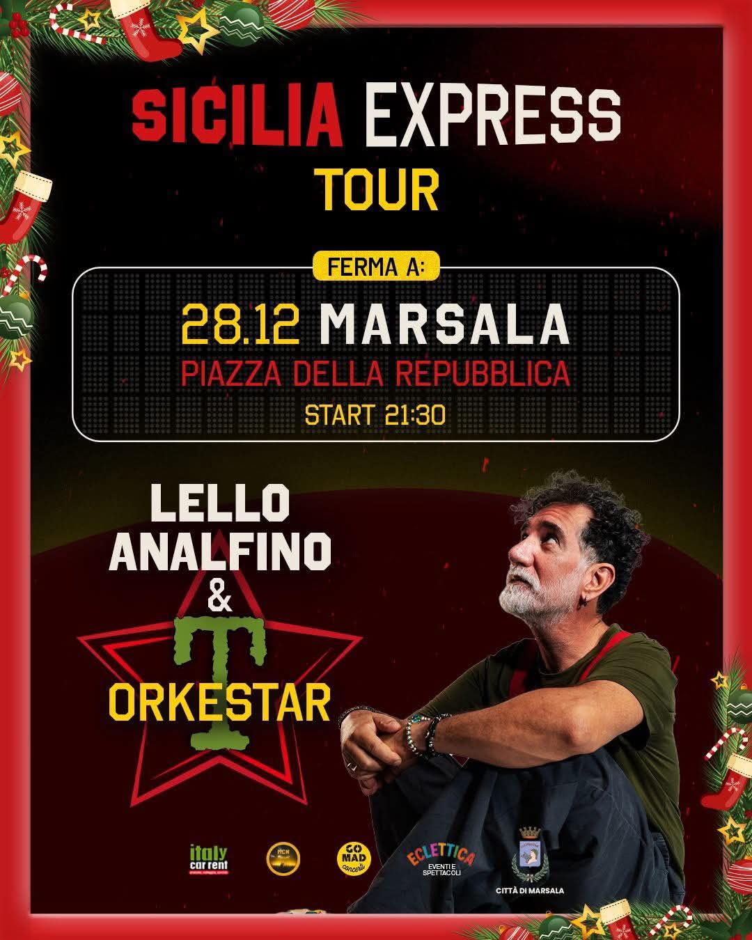 Il cantautore Lello Analfino e la band T-Orkestar, noti per aver fuso suoni tradizionali siciliani con musica moderna in energici spettacoli dal vivo. Attualmente sono impegnati nel loro "Sicilia Express Tour" attraverso l'Italia e in Piazza della Repubblica Marsala Dicembre 28, 2025 alle 21:30, con nuova musica come il singolo "Zero stress" e celebrando la cultura siciliana
