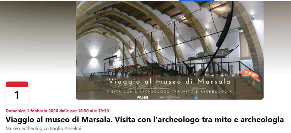 Domenica 1 Febbraio 2026 dalle ore 16.30 alle 19.30 - Viaggio al museo di Marsala - Visita con l'archeologo tra mito e archeologia al Museo Archeologico Baglio Anselmi Marsala