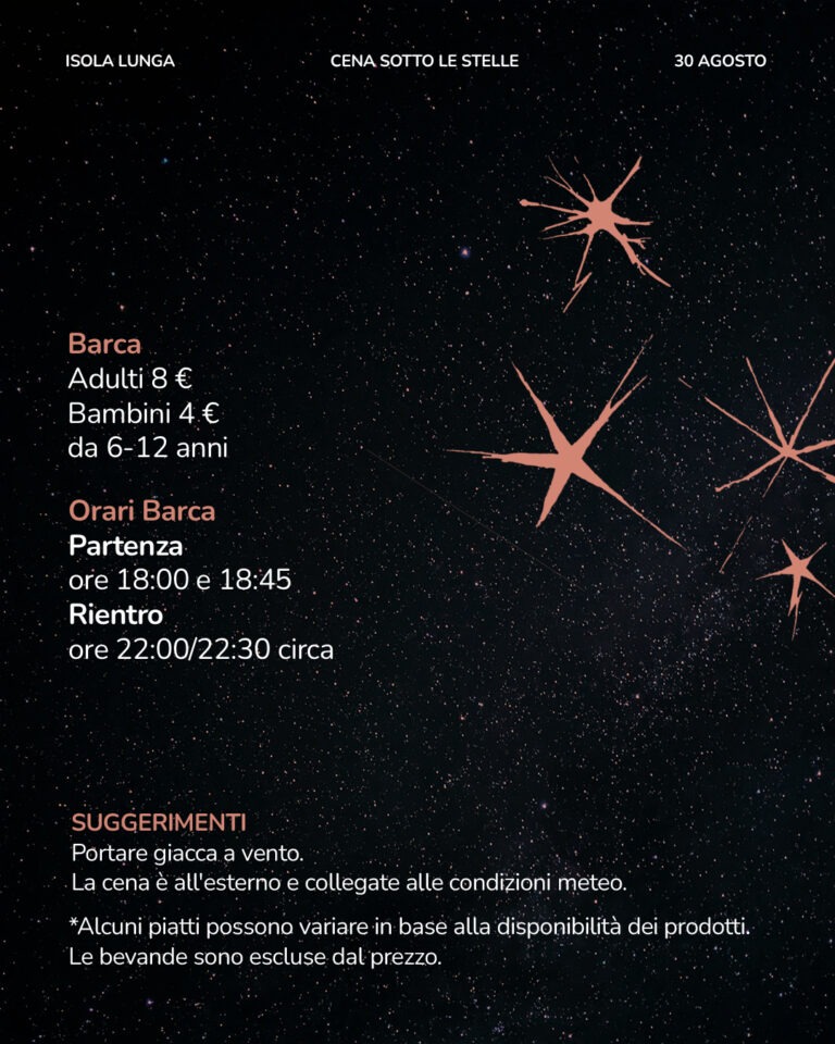 30 Agosto - Isola Lunga - Cena Sotto Le Stella al suono di Europa String Choir - Partenza ore 18.00 e ore 18.45 - Rientro ore 22.00 e 22.30 circa - Portare giacca a vento. La cena è all'esterno e collegate alle condizioni meteo.