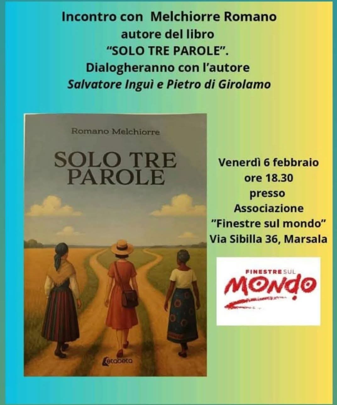 Incontro con Melchiorre Romano autore del libro "Solo Tre Parole" - Dialogheranno con l'autore Salvatore Inguì e Pietro di Girolamo - Venerdi 6 Febbraio ore 18.30 presso Associazione "Finestre Sul Mondo" Via Sibilla 36 Marsala