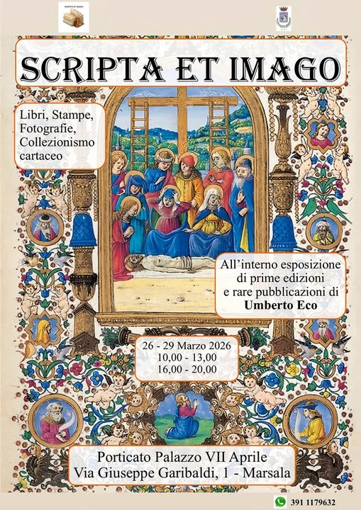 Torna protagonista la cultura con la mostra di libri antichi a Marsala, in programma dal 26 al 29 marzo 2026 presso il Porticato di Palazzo VII Aprile. Uno dei momenti più attesi della mostra di libri antichi a Marsala sarà la sezione dedicata a Umberto Eco.