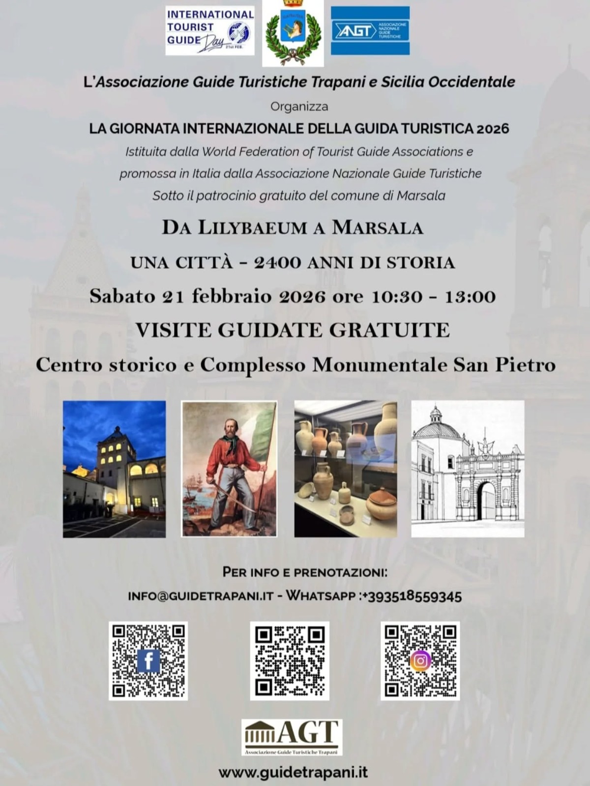 Meeting with the participants at Porta Nuova. From there you reach the Mother Church founded in the 12th century by the Normans and named after St Thomas Becket, Archbishop of Canterbury. We continue towards the Church of Purgatory, an example of Sicilian Baroque, where the foundations of settlements from the Punic, Roman and medieval periods are visible next to it. The walk ends on Via Garibaldi, where several wine shops bear witness to the city's winemaking vocation, famous throughout the world for its Marsala fortified wine. After the conclusion of the visit to the historic center, the participants go to the monumental complex of San Pietro for the visit of the Archaeological Section and the Garibaldina Section, witness to the Landing of the Thousand which took place in the city on May 11, 1860.