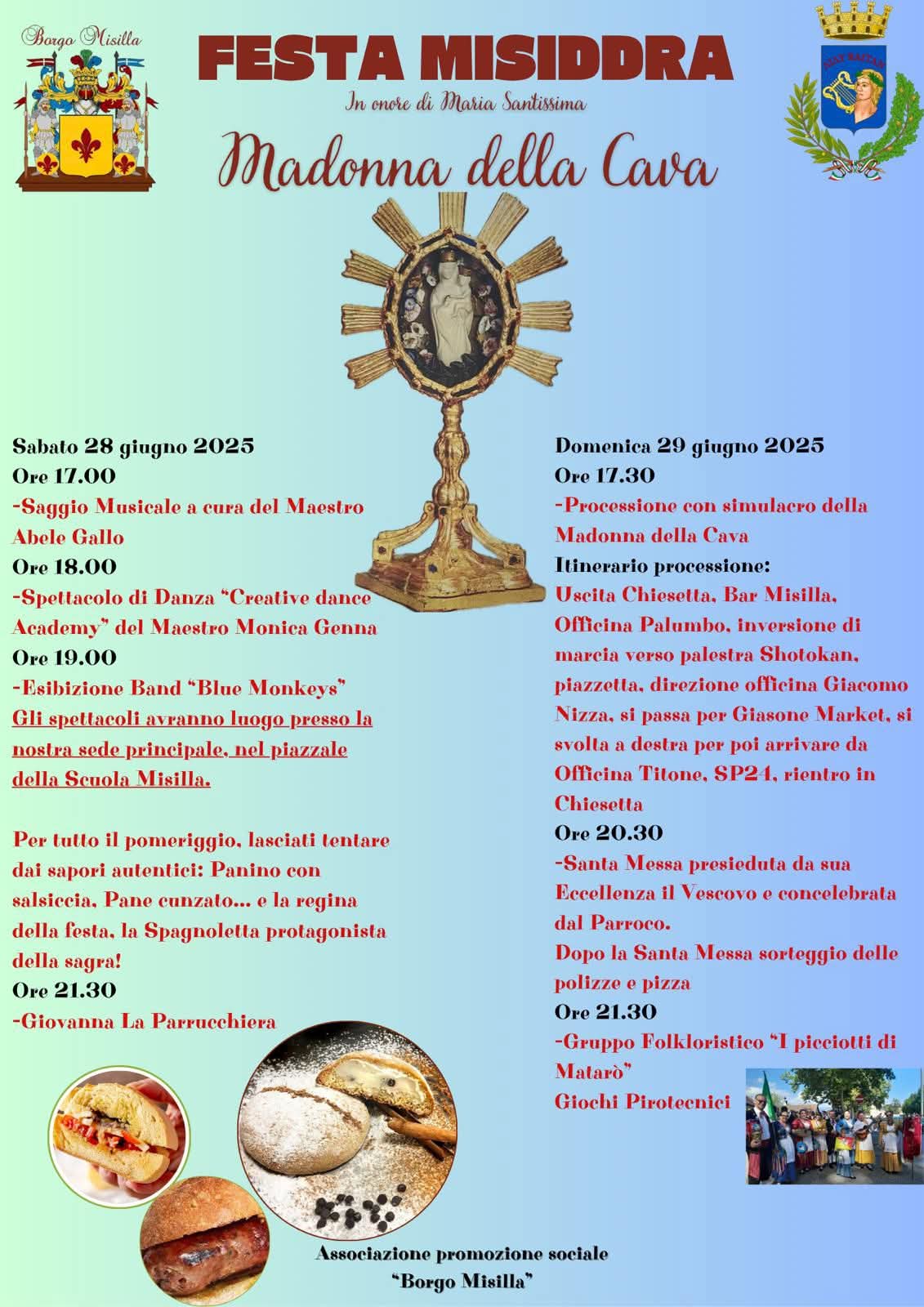 Sabato 28 e Domenica 29 Giugno due giorni di Festa Misiddra in onore di Maria Santissima Madonna della Cava - Sabato dalle ore 17:00 saggio musicale, spettacolo di danza, esibizione band "Blue Monkeys" - per tutto il pomeriggio: panino con salsiccia, pane cunzato e la spagnoletta - in fine alle 21:30 Giovanna la Parrucchiera. Domenica dalle 17:30 la Processione con simulcro della Madonna della Cava e la Santa Messa, alle 21:30 Gruppo Folkloristico e giochi pirotecnici.